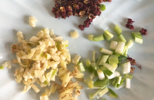 3、起锅烧油,加入肉末翻炒至变色微黄,加入郫县豆瓣酱炒出红油,倒入葱姜蒜,花椒炒香。