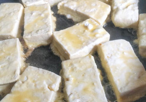 5、将锅子烧热,倒入适量食用油,平铺放入豆腐块,中小火慢煎。