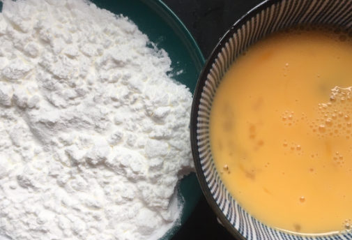 3、然后准备一个盘子,倒入一层薄薄的淀粉,再将鸡蛋磕入一个碗中打散。