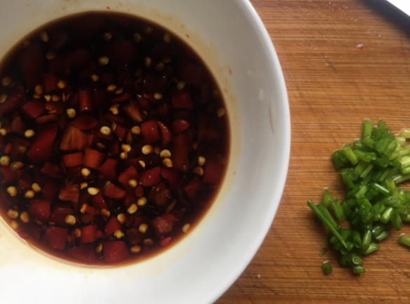 6、煎豆腐期间,调酱汁;碗中倒入生抽、糖、剁辣椒、小半碗水,搅拌均匀,葱花切碎。