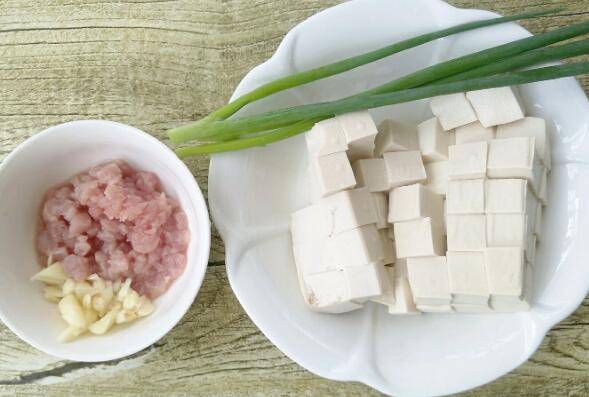 2、葱姜蒜切碎,猪肉剁成末,豆腐切成小正方形。