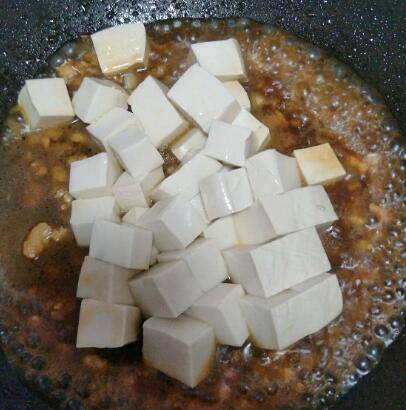 4、加入老抽翻炒,加入清水,加胡椒粉和糖煮五分钟,倒入豆腐块大火煮开,转中小火盖盖子闷煮8分钟左右。