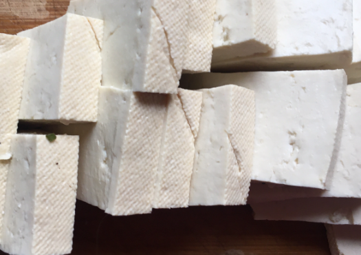 2、将老豆腐切成约1厘米左右的厚片。豆腐要用北豆腐,这种豆腐材质略硬,水份较少,不易破碎,更适合来煎炸。