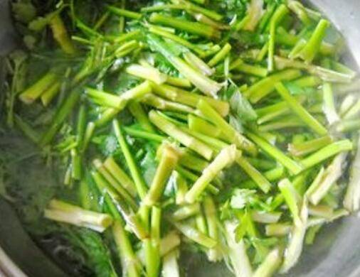 切好的水芹入开水中焯一会;捞起,沥干水分备用。