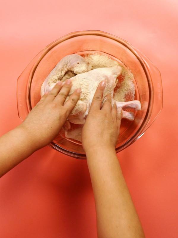 2、将三黄鸡放入大碗中,倒入盐焗粉、盐,抹匀,腌制1小时。