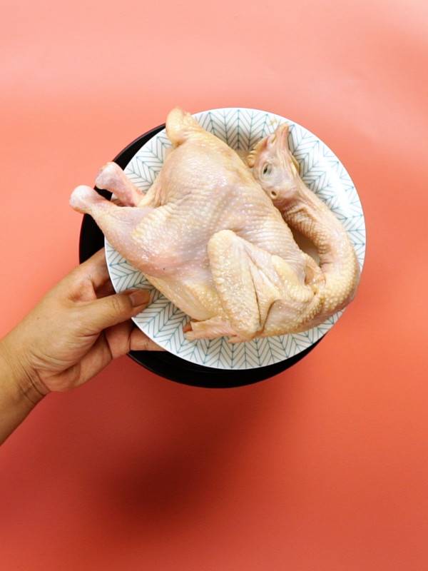 1、三黄鸡清洗干净,用厨房纸吸去水分。姜切片备用。
