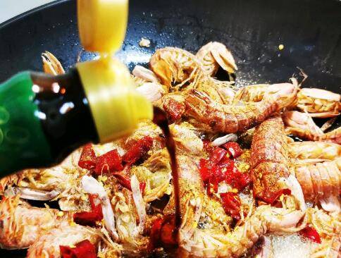 锅里放油烧热,把姜片烧几十秒,倒入濑尿虾,放料酒翻炒几下,盖上锅盖,中途不定时开盖翻炒。