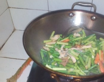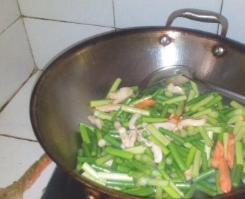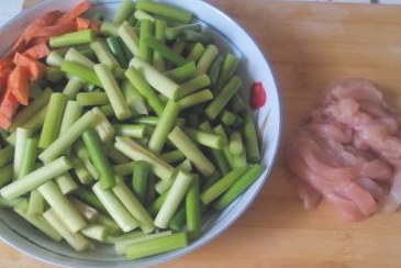 将蒜苔切成段,鸡肉和胡萝卜切成条;