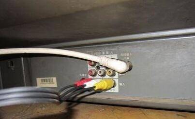 3、把AV线另外一段分出的三个接头对应电视视频输入口的相应的颜色插入(即红、白、黄对应插入)。天线输入出接入电视线,方便播放电视信号节目。