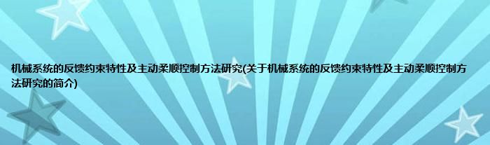 大家好,机械系统的反馈约束特性及主动柔顺控制方法研究,关于机械系统的反馈约束特性及主动柔顺控制方法研究的简介很多人还不知道,现在让我们一起来看看吧!