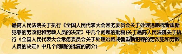 1、 最高人民法院关于执行《全国人民代表大会常务委员会关于处理逃跑或者重新犯罪的劳改犯和劳教人员的决定》中几个问题的批复在1990.06.11由最高人民法院颁布。