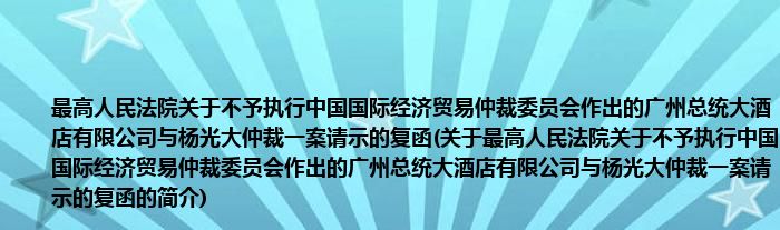 1、 《最高人民法院关于不予执行中国国际经济贸易仲裁委员会作出的广州总统大酒店有限公司与杨光大仲裁一案请示的复函》在2002.07.22由最高人民法院颁布。