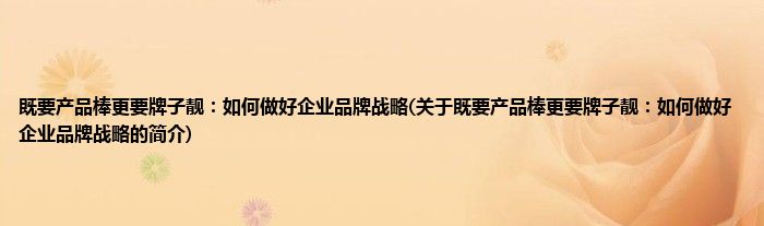 大家好,既要产品棒更要牌子靓:如何做好企业品牌战略,关于既要产品棒更要牌子靓:如何做好企业品牌战略的简介很多人还不知道,现在让我们一起来看看吧!