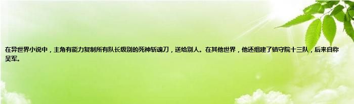大家好,小常来为大家解答以上问题。在异世界小说中,主角有能力复制所有队长级别的死神斩魂刀,送给别人。在其他世界,他还组建了镇守院十三队,后来自称吴军。很多人还不知道,现在让我们一起来看看吧!
