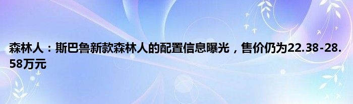 近日,编辑获得斯巴鲁新款森林人的配置信息以及疑似售价。新车在现有车型基础上增加了X-BREAK运动版和更入门的旗舰版EyeSight,价格或为25.38-26.38万元之间,而整体车系的价格不变,仍为22.38-28.58万元。