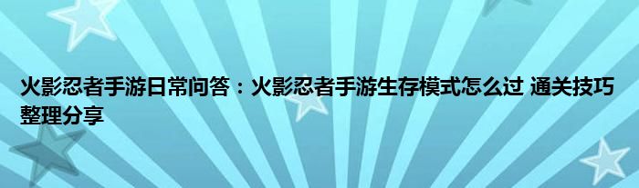 小编今天给各位玩家朋友们带来的是火影忍者手游日常问答:火影忍者手游生存模式怎么过,通关技巧整理分享,有记得的玩家朋友吗?不记得也没有关系,小编已经帮助大家把火影忍者手游日常问答:火影忍者手游生存模式怎么过,通关技巧整理分享找了出来,你只需要动动你的小手就可以轻松知道啦,快来瞧一瞧吧。