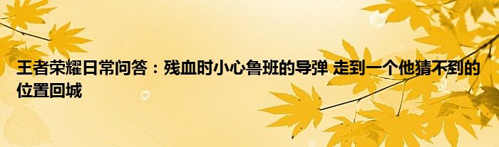 小编今天给各位玩家朋友们带来的是王者荣耀日常问答:残血时小心鲁班的导弹,走到一个他猜不到的位置回城,有记得的玩家朋友吗?不记得也没有关系,小编已经帮助大家把王者荣耀日常问答:残血时小心鲁班的导弹,走到一个他猜不到的位置回城找了出来,你只需要动动你的小手就可以轻松知道啦,快来瞧一瞧吧。