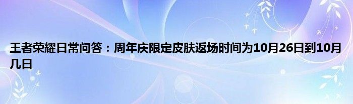 以上就是王者荣耀日常问答:周年庆限定皮肤返场时间为10月26日到10月几日的推荐,相信通过王者荣耀日常问答:周年庆限定皮肤返场时间为10月26日到10月几日这篇文章能帮到你,也欢迎对游戏很感兴趣小伙伴们一起来探讨。