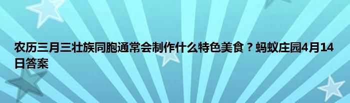 每年农历“三月三”,壮族同胞通常会制作,什么特色美食庆祝?蚂蚁庄园每天都会问玩家一些问题,答对了的话就能领取饲料给小鸡喂食。4月14日的最新问题发布,以下是详细答案,一起来看看吧。