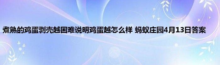 蚂蚁庄园小课堂是一个非常有趣的答题的玩法,很多玩家都在这里通过回答问题的方式来获得了大量的饲料,但是前提是你一定要回答正确哦。4月13日的问题已经给玩家们更新出来了,今天的问题是煮熟的鸡蛋剥壳越困难说明鸡蛋越怎么样?那下面就是4月13日小课堂答案的介绍,一起看下吧。