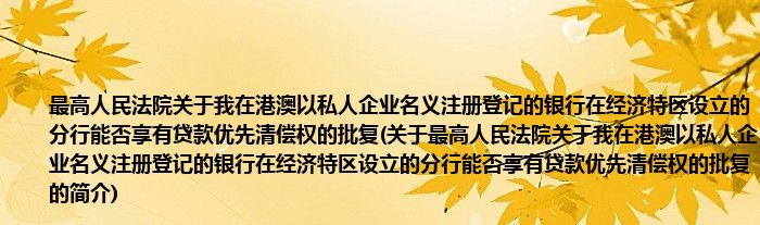 本文关于最高人民法院关于我在港澳以私人企业名义注册登记的银行在经济特区设立的分行能否享有贷款优先清偿权的批复的简介就讲解完毕,希望对大家有所帮助。